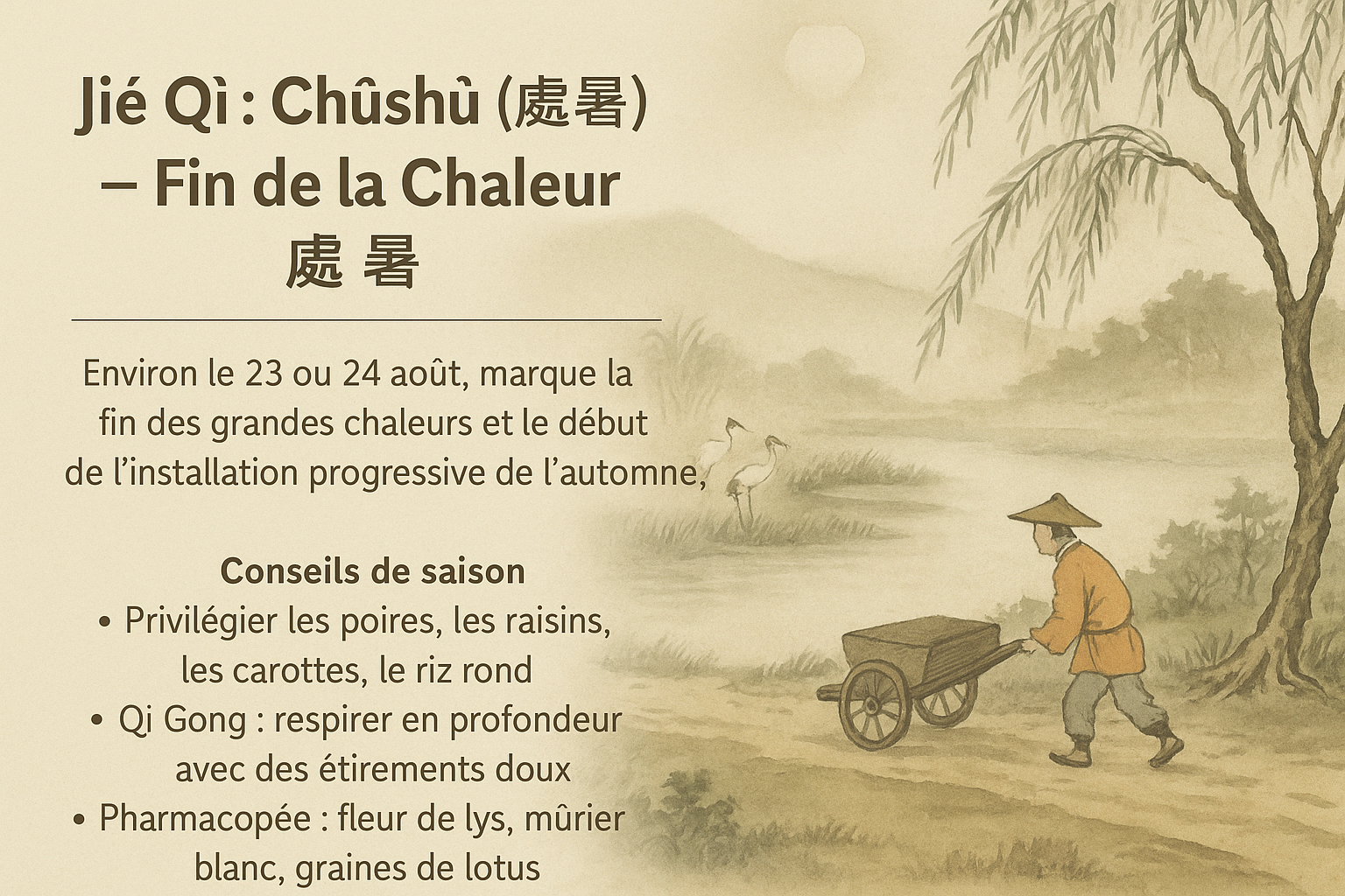 Vers le 23 ou 24 août, le calendrier solaire chinois entre dans la période de Chǔshǔ (處暑), littéralement « retraite de la chaleur ». Ce Jié Qì marque la fin officielle des fortes chaleurs estivales : les canicules s’atténuent, les nuits se rafraîchissent, la lumière décline doucement, et le souffle de l’automne commence à s’installer avec plus de netteté.