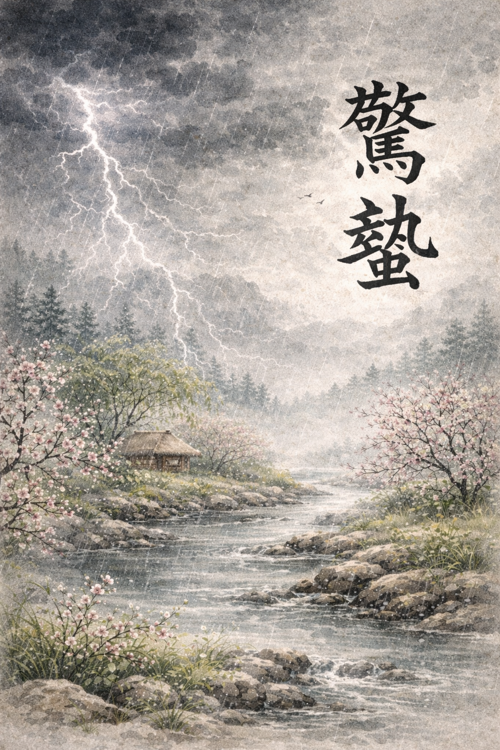 Jīngzhé évoque donc le moment où le premier tonnerre printanier gronde et réveille les êtres encore enfouis dans le sol. Symboliquement, c’est le moment où ce qui était latent devient actif.