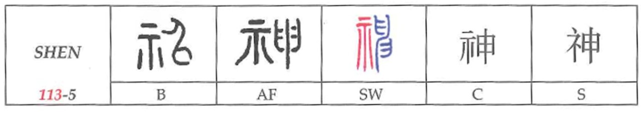 Shén 神 (fig.2) désigne le principe spirituel venu du Ciel. Dans ses formes anciennes, il associe le Soleil, la Lune et les étoiles : ce sont les influences célestes descendantes, responsables de l’animation du vivant. Pour Wieger ; le radical représente les deux lignes horizontales ⼆ qui sont l’ancienne forme du caractère 上, haut supérieur ; elles signifient ici le ciel. Les trois lignes verticales , figurent ce qui pend au ciel, à savoir le soleil, la lune et les étoiles dont les mutations révèlent aux hommes les choses transcendantes. Pour la partie droite, ce sont deux mains qui étendent une corde, avec l’idée d’extension, d’expansion. Plus tard, la corde dressée fut interprétée comme étant un homme debout, qui se ceint avec ses deux mains. Tout cela est moderne. La caractère ancien fut une primitive figurant l’expansion alternant des forces naturelles. Pour le Shuō Wén[i], ce sont les esprits du Ciel qui amènent tous les êtres à la réalisation de leur existence.