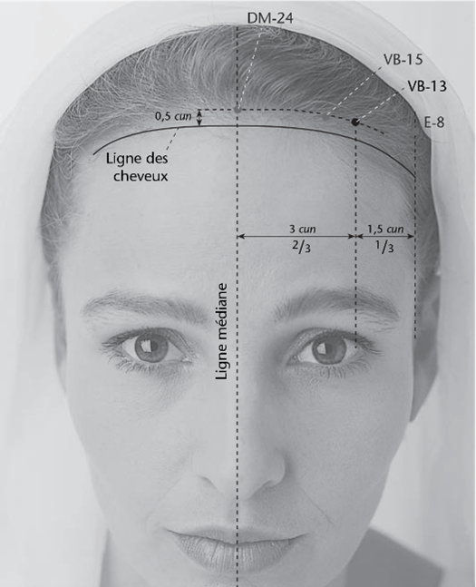 Le 13VB Běnshén se situe à 0,5 cùn en dedans de la ligne d’implantation des cheveux, juste au-dessus du canthus externe de l’œil (fig.3), soit 3 cùn en dehors de la ligne médiane.